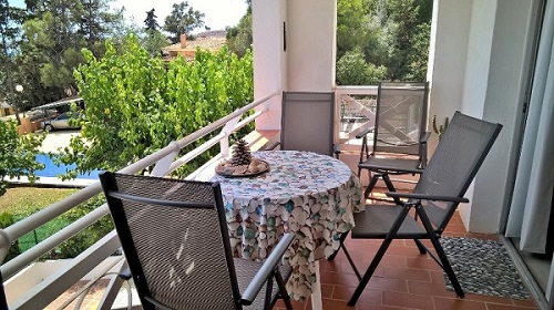 Meren rantaan matkaa on vain 500 m. Talon 1. kerroksessa on 1 mh:n siististi kalustettu, valoisa asunto, johon kuuluu olohuone, keittiö, kylpyhuone, ja etelän suuntainen iso terassi, josta näköalat merelle ja uima-allasalueelle.